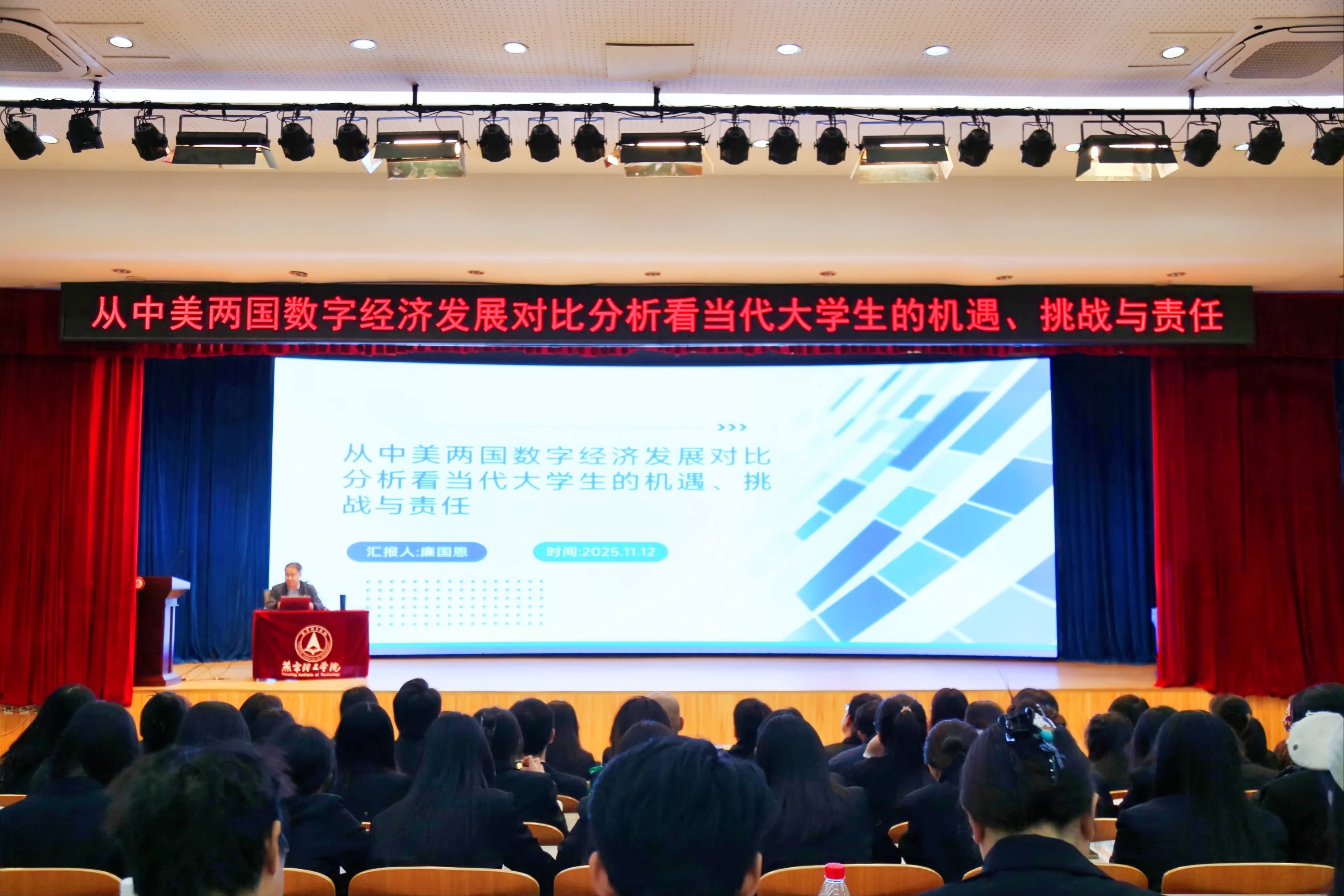 本网讯(党委办公室 黄薇嘉 耿小腾 赵煜 李卓 )2025年11月12日下午,燕京理工学院2025年秋季入党积极分子(高级)培训班专题党课第六讲在报告厅如期举行,此次培训的主题为“从中美两国数字经济发展对比分析看当代大学生的机遇、挑战与责任”。本次培训由燕京理工学院国际商学院院长廉国恩教授主讲。廉院长将国家战略、科技前沿与青年使命深度融合,为全体学员呈现了一堂兼具思想性、知识性与实践性的“数字党课”。