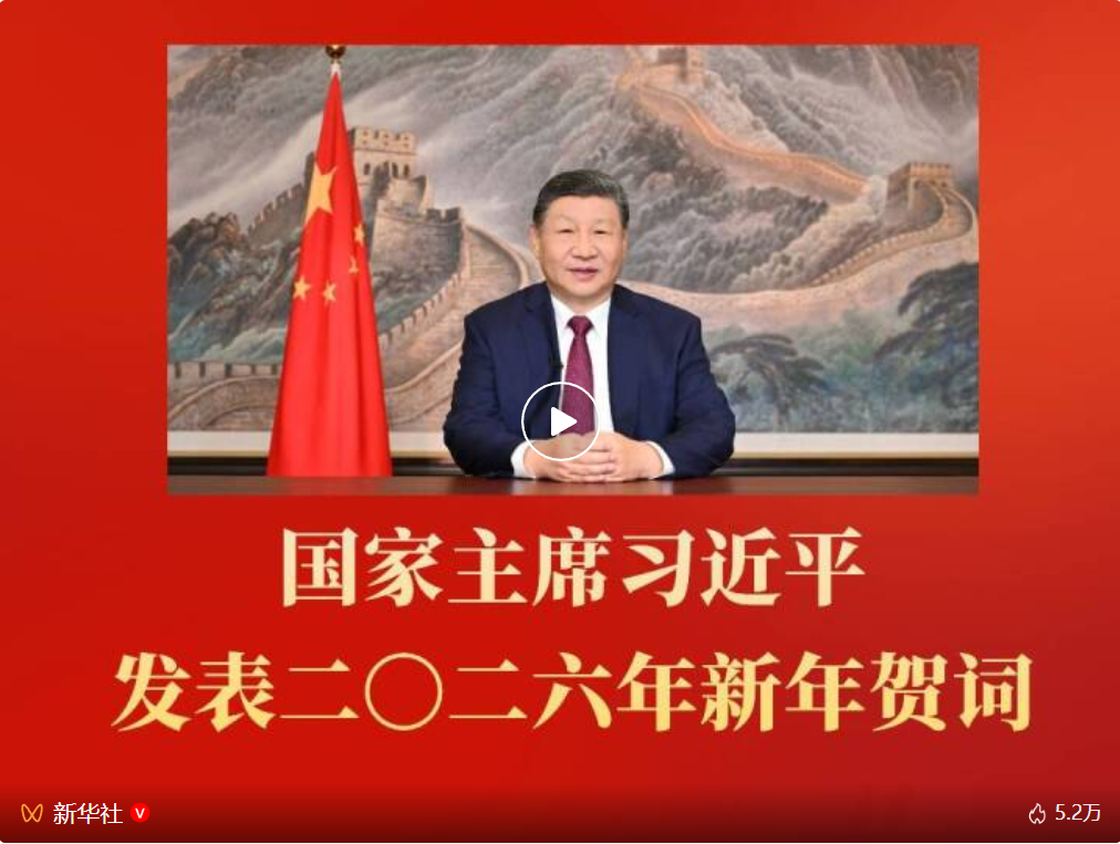 新年前夕,国家主席习近平通过中央广播电视总台和互联网,发表了二〇二六年新年贺词。全文如下: