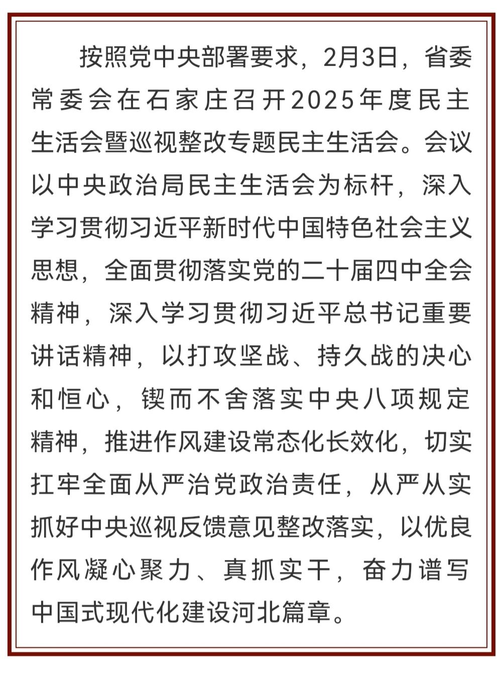 河北省委常委会召开2025年度民主生活会暨巡视整改专题民主生活会